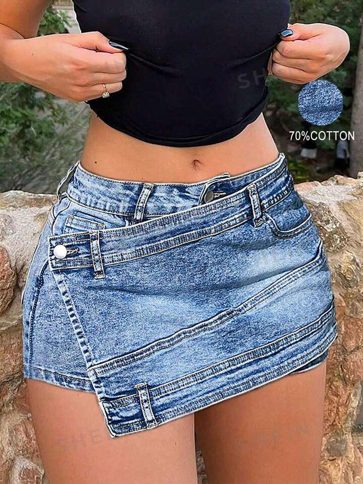 Rave Y2K Street Vintage Stretch Overlap Waist Wrap Solid Asymmetrical Hem A-line Skinny Mini Denim