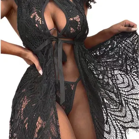 Sfy 1493 Women's lace long gown Bathrobe Sexy Mesh sleepwear women robe Summer beachwear lingerie Sexi